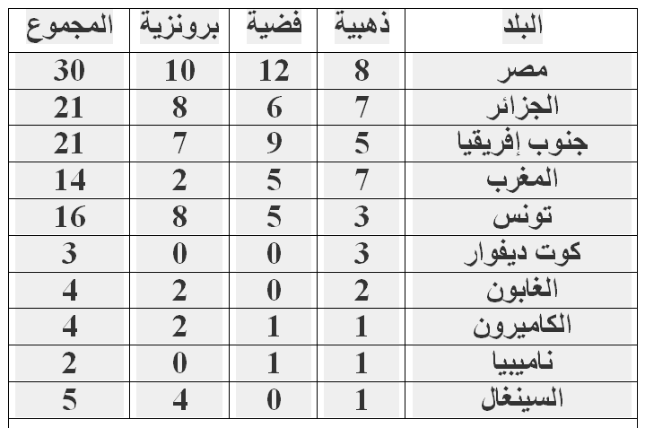 ورفعت مصر رصيدها إلى 30 ميدالية منها ثماني ذهبيات و12 فضية و10 برونزية، متقدمة على الجزائر في المركز الثاني بمجموع 21 ميدالية (7 ذهبية و6 فضية و8 برونزية) ، تليها جنوب إفريقيا في الرتبة الثالثة بمجموع 14 ميدالية (7 ذهبية و5 فضية و2 برونزية)، ثم المغرب برصيد 21 ميدالية ( 5 ذهبية و9 فضية و7 برونزية).