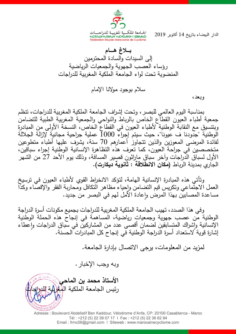 بمناسبة اليوم العالمي للبصر وتحت إشراف الجامعة الملكية المغربية للدراجات تنظم جمعية أطباء العيون القطاع الخاص بالرباط والنواحي والجمعية المغربية الطبية للتضامن وبتنسيق مع النقابة الوطنية لأطباء العيون في القطاع الخاص، النسخة الأولى من المبادرة الوطنية “جدودنا ف عيونا”. وذلك بمشاركة جمعية نهضة الشباب الحسناوي لسباق الدراجات الهوائية سيدي سليمان