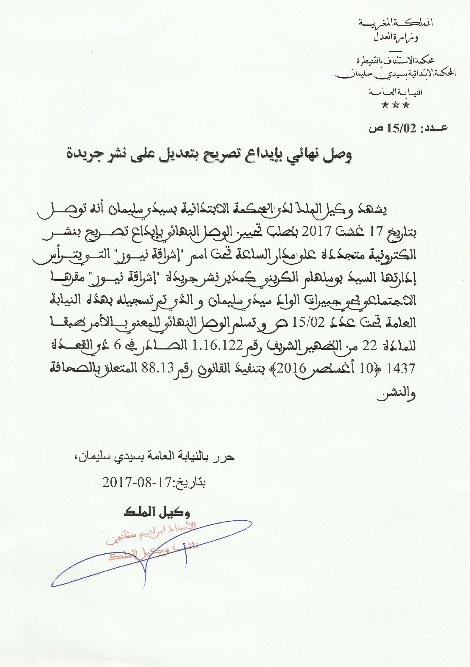 وللإشارة فجريدة إشراقة نيوز هي الجريدة الإلكترونية الوحيدة التي تتوفر على الملاءمة بسيدي سليمان وصل عدد 02/15 ص مسلم من النيابة العامة بالمحكمة الابتدائية بسيدي سليمان.