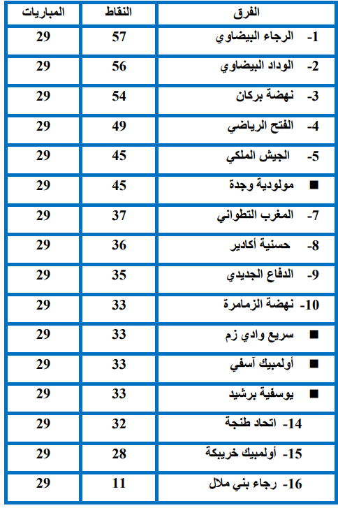 في ما يلي ترتيب أندية البطولة الوطنية الاحترافية للقسم الأول في كرة القدم، في أعقاب مبارايات الدورة ال29 ، ماقبل الأخيرة، التي جرت أمس الثلاثاء واليوم الأربعاء.