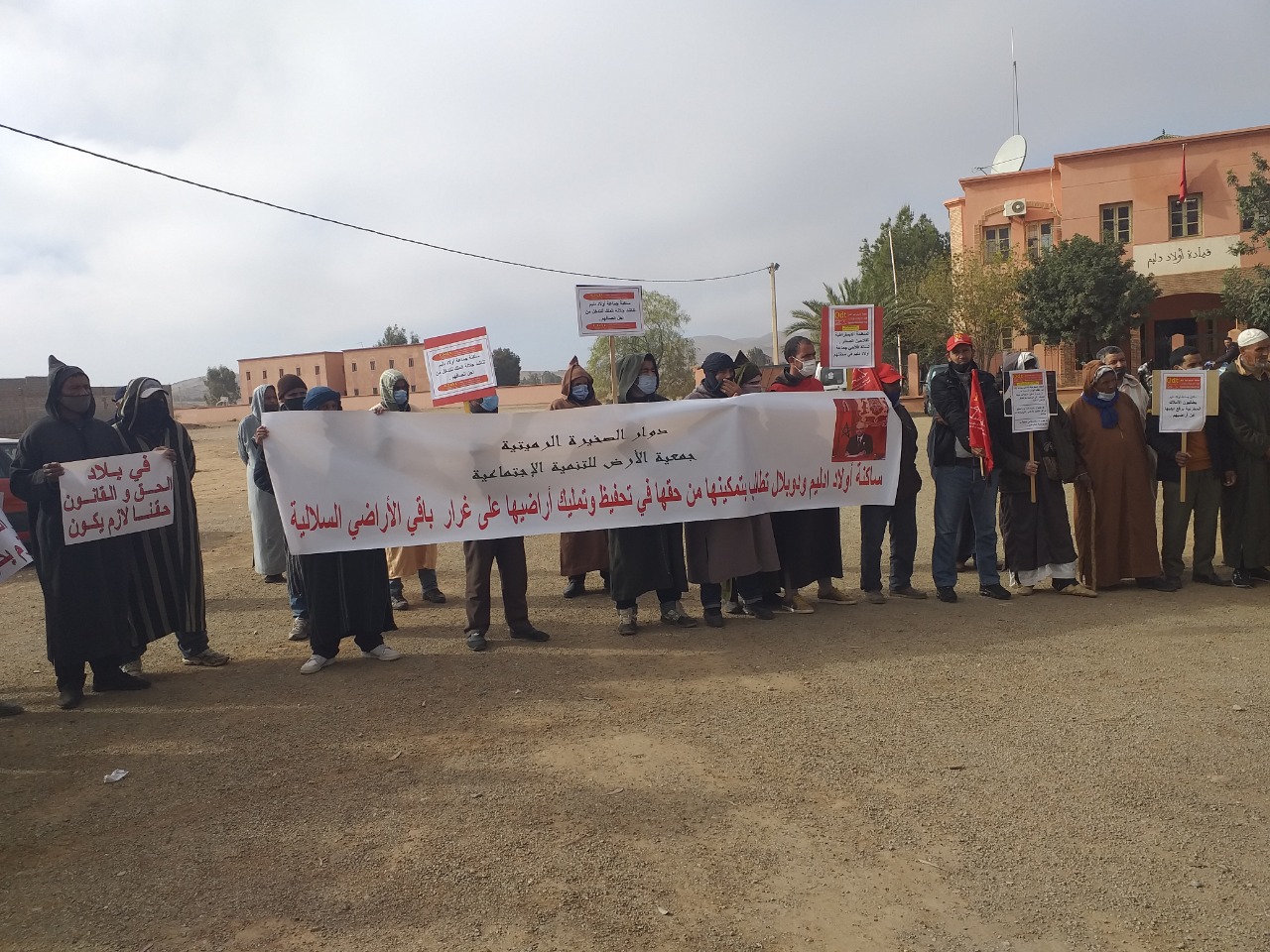 نظمت المنظمة الديمقراطية للفلاحين الصغار، بجماعة أولاد دليم، المنضوية تحت لواء المنظمة الديمقراطية للشغل، وقفة احتجاجية، للمطالبة بوقف مسطرة تفويت أراضيهم التي ورثوها عن اجدادهم، إلى ملك الدولة الخاص ( الأملاك المخزنية )، والتي عبر من خلالها المحتجون عن غضبهم و امتعاضهم، عن هذا القرار الجائر، وطالبوا بضرورة نهج مسطرة تمليك الأراضي لذوي الحقوق، تحت إشراف مجلس الوصاية على الصعيد الوطني، التابع لوزارة الداخلية، و اللجنة النيابية، على الصعيد المحلي، و إعطاء لكل ذي حق حقه، ليتمكن سكان الجماعة و خصوصا الفلاحين منهم، من الاستفادة من مجموعة من البرامج التنموية وعلى رأسها برنامج مخطط المغرب الأخضر، و الصندوق الوطني لتنمية العالم القروي…