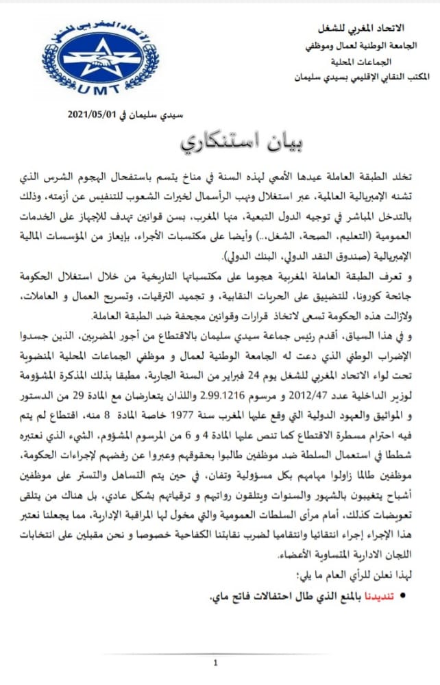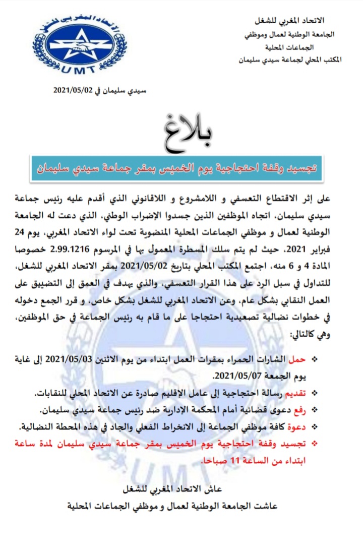 وغير بعيد عن هذا فقد أصدر المكتب النقابي الإقليمي للجامعة الوطنية لعمال وموظفي الجماعات المحلية بسيدي سليمان المنضوي تحت لواء الاتحاد المغربي للشغل، بيانا استنكاريا قرر فيه ما يلي: