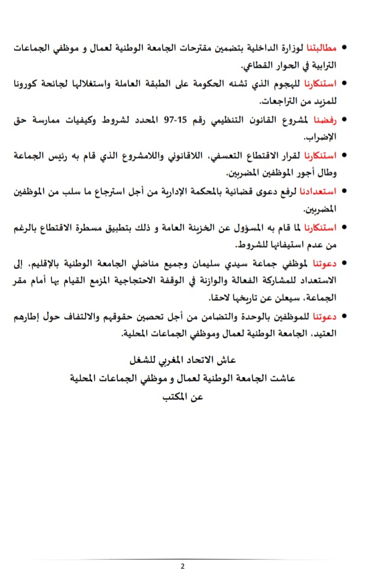 - استنكار قرار الاقتطاع التعسفي، اللاقانوني واللامشروع الذي قام به رئيس الجماعة وطال أجور الموظفين المضربين.
