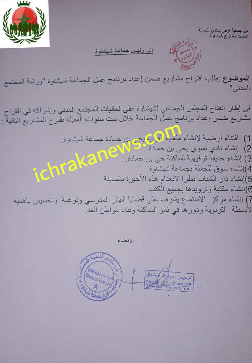 في مراسلة من جمعية أرض بلادي للتنمية المستدامة فرع شيشاوة، والتي حصلت جريدة “إشراقة نيوز” الإلكترونية على نسخة منها، موجهة اليوم الخميس 13 يناير 2022، إلى رئيس الجماعة ، موضوعها طلب اقتراح مشاريع ضمن إعداد برنامج عمل الجماعة خلال الست السنوات المقبلة.